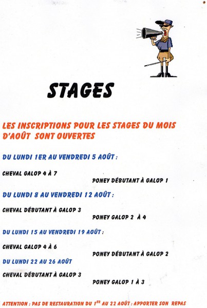Voici les dates de stages du mois d'Aout. Pour tous renseignements ou pour une inscription, n'hésitez pas à vous rapprocher des monitrices, ou à téléphoner au bureau.